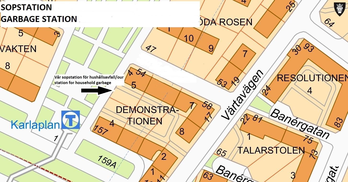 There are three separation stations for paper, glass, newspapers, rigid plastics, card board, tins, metals, batteries etc. rather close to Strindbergsgatan 54 You can find them on Erik Dahlbergsgatan close to Blanchegatan, Östermalmsgatan 88 and one in the corner of Valhallavägen/Oxenstiernsgatan. See map on top of the page. The area is also visited by a mobile waste station regularly